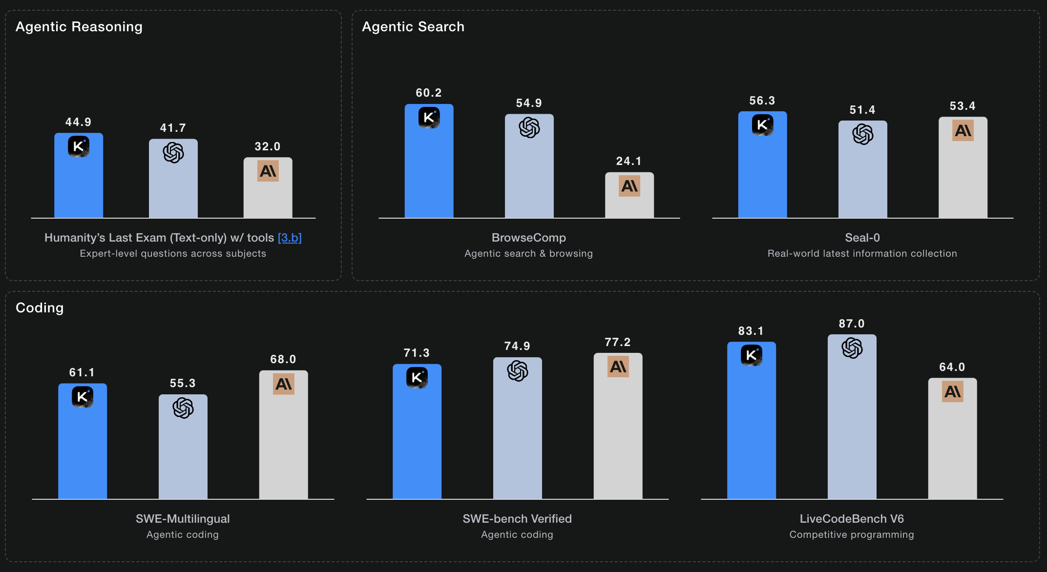 K2 Thinking exhibits substantial gains in coding and software development tasks. It achieves scores of 61.1% on SWE-Multilingual, 71.3% on SWE-Bench Verified, and 47.1% on Terminal-Bench, showcasing strong generalization across programming languages and agent scaffolds.
